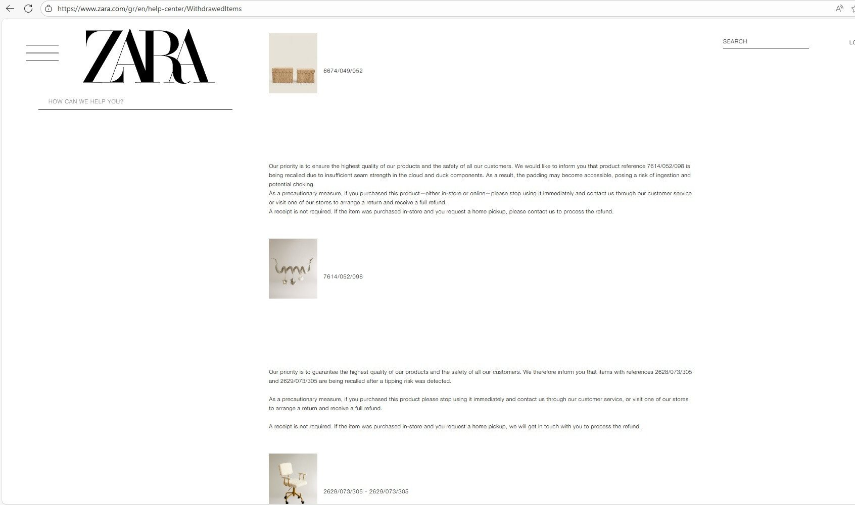 Σύμφωνα με την επίσημη ανακοίνωση της ZARA που είναι ανηρτημένη και στην αγγλική έκδοση της ιστοσελίδας του ελληνικού καταστήματος «Προτεραιότητά μας είναι να εγγυηθούμε την υψηλότερη ποιότητα των προϊόντων μας και την ασφάλεια όλων των πελατών μας. Ως εκ τούτου, σας ενημερώνουμε ότι τα προϊόντα με τους κωδικούς 2628/073/305 και 2629/073/305 ανακαλούνται μετά την ανίχνευση κινδύνου ανατροπής.