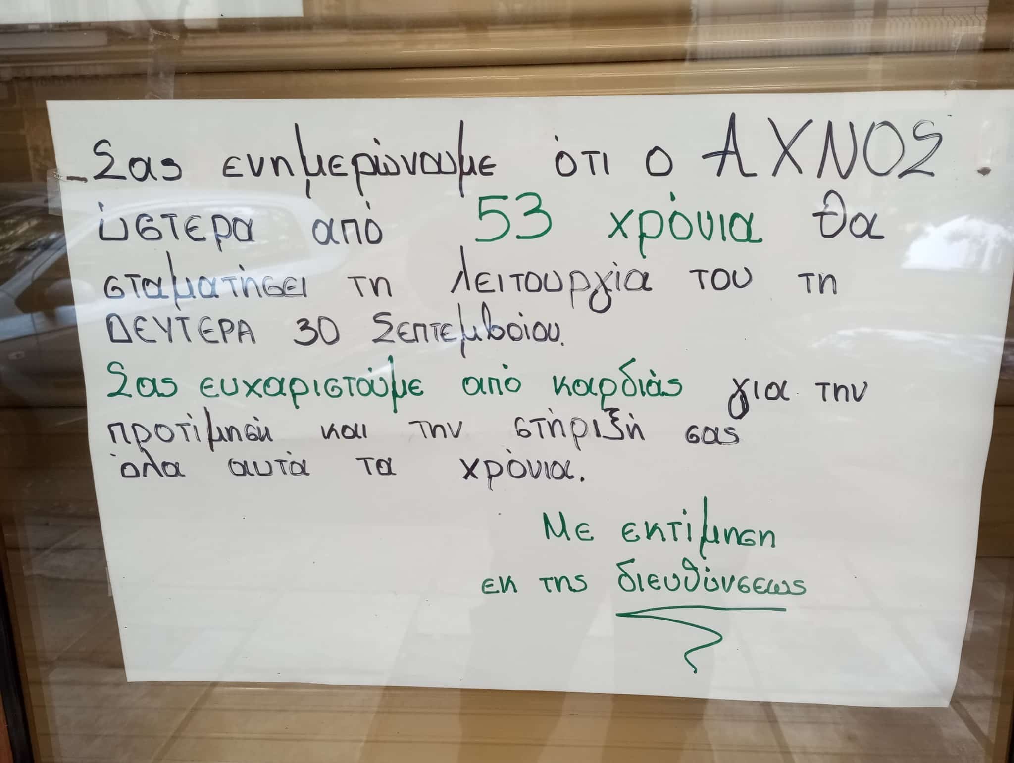 Στην τζαμαρία του καταστήματος έχει αναρτηθεί ένα συγκινητικό μήνυμα ευχαριστίας προς τους πελάτες, που στήριξαν το εστιατόριο σε αυτή την πολύχρονη διαδρομή. Το κλείσιμο του «Αχνού» αφήνει μια ιδιαίτερη απώλεια για την πόλη, καθώς αποτελεί το τέλος μιας εποχής για τη γαστρονομική και κοινωνική ζωή της Θεσσαλονίκης.