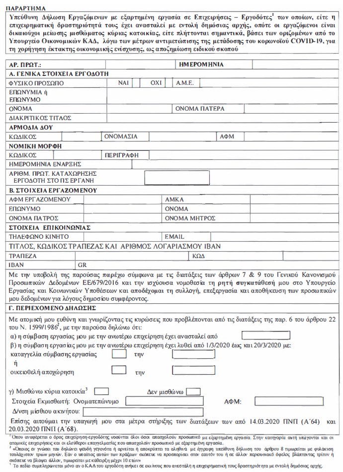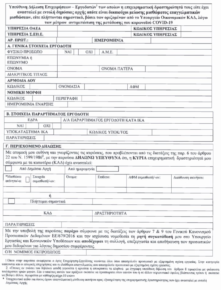 12. Οι εργαζόμενοι υποβάλλουν υποχρεωτικά υπεύθυνη δήλωση του ν. 1599/1986 (Α’ 75), με τίτλο «Υπεύθυνη Δήλωση Εργαζόμενων με εξαρτημένη εργασία σε Επιχειρήσεις – Εργοδότες των οποίων, είτε η επιχειρηματική δραστηριότητά τους έχει ανασταλεί με εντολή δημόσιας αρχής, οπότε οι εργαζόμενοι είναι δικαιούχοι μείωσης μισθώματος κύριας κατοικίας, είτε πλήττονται σημαντικά, βάσει των οριζομένωναπό το Υπουργείο Οικονομικών ΚΑΔ, λόγω των μέτρων αντιμετώπισης της μετάδοσης του κορωνοϊού COVID-19, για τη χορήγηση έκτακτης οικονομικής ενίσχυσης, ως αποζημίωση ειδικού σκοπού» στην ηλεκτρονική πλατφόρμα του ειδικού μηχανισμού στήριξης των εργαζομένων (supportemployees.yeka.gr).