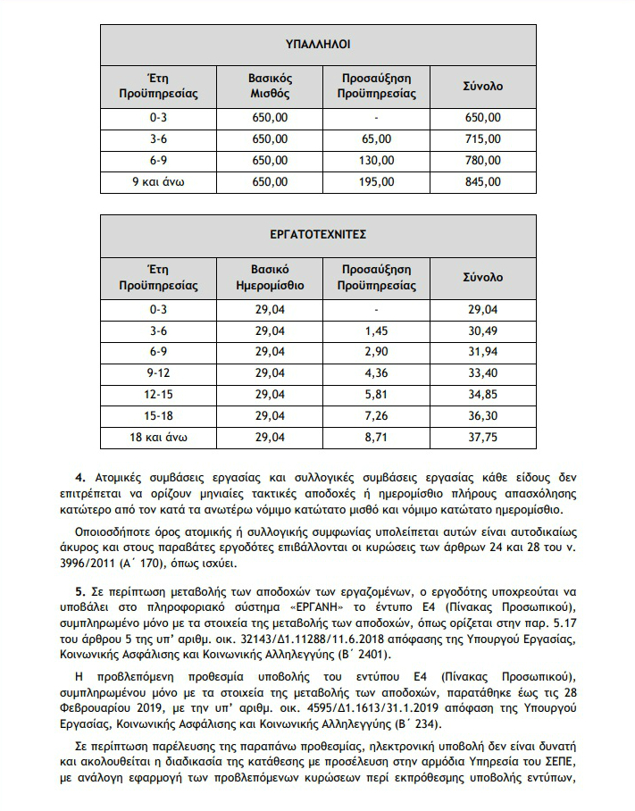 Όλοι οι εργοδότες είναι υποχρεωμένοι να δηλώσουν τις μεταβολές αποδοχών, λόγω της αύξησης του κατώτατου μισθού, υποβάλλοντας τις ανάλογες πληροφορίες στο Πληροφοριακό Σύστημα«ΕΡΓΑΝΗ» έως τις 28/02/2019 το έντυπο Ε4, συμπληρωμένο μόνο με τα στοιχεία της μεταβολής των αποδοχών.
