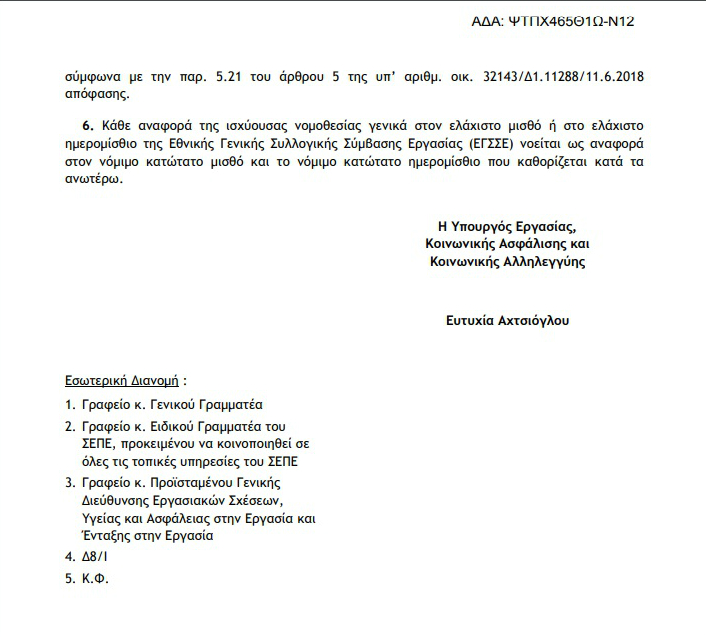 Η Υπουργός Εργασίας Έφη Αχτσιόγλου, υπέγραψε την εγκύκλιο με τις οδηγίες για την εφαρμογή της αύξησης του κατώτατου μισθού και του κατώτατου ημερομισθίου, τόσο για τους υπαλλήλους όσο και για τους εργατοτεχνίτες της χώρας.