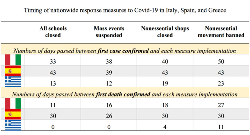 Ο παρακάτω πίνακας συγκρίνει τις ημέρες που πέρασαν σε κάθε χώρα (Ισπανία, Ιταλία, Ελλάδα) από την στιγμή που παρουσιάστηκε το πρώτο κρούσμα και ο πρώτος θάνατος μέχρι την στιγμή που πάρθηκαν σημαντικά μέτρα. Η διαφορά της Ελλάδας από τις άλλες δύο χώρες είναι ενδεικτική του πόσο πολύτιμος χρόνος κερδίθηκε.
