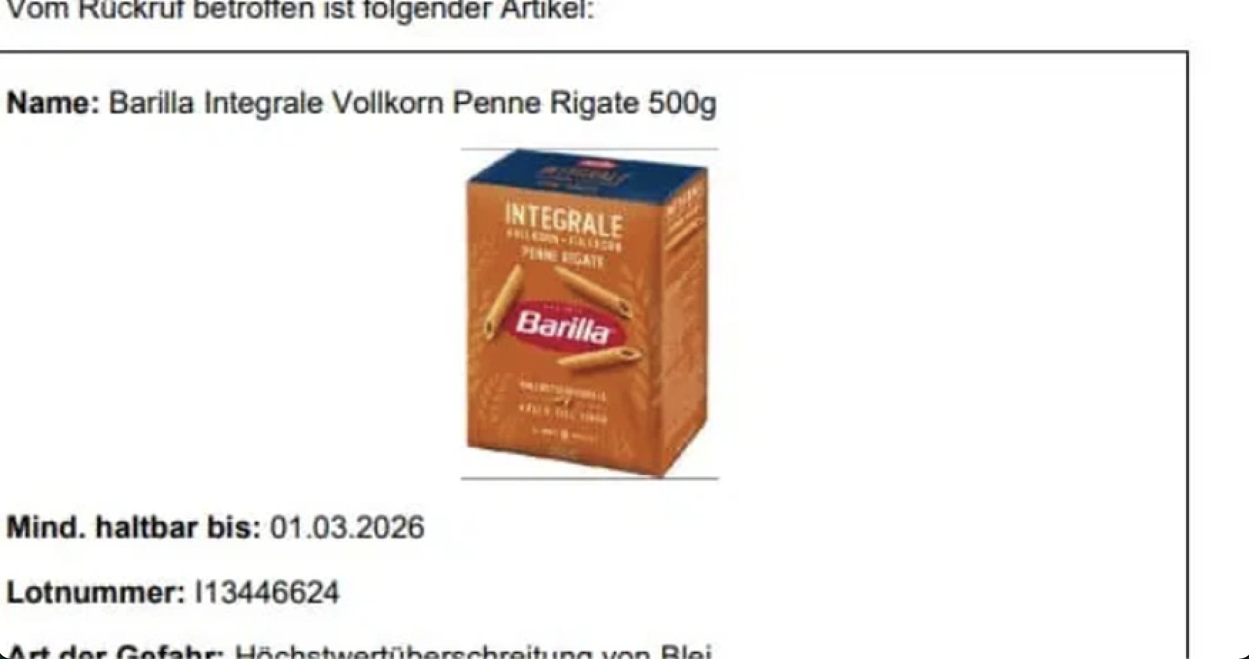 Η Ευρωπαϊκή Ένωση εξέδωσε πρόσφατα προειδοποίηση μέσω του Συστήματος Έγκαιρης Προειδοποίησης για τα Τρόφιμα και τις Ζωοτροφές (RASFF) για σοβαρό κίνδυνο για τη δημόσια υγεία από ζυμαρικά ιταλικής προέλευσης. Συγκεκριμένα, τα ζυμαρικά Barilla Integrale Vollkorn Penne Rigate 500g εντοπίστηκαν με περιεκτικότητα σε μόλυβδο 1,0 mg/kg, υπερβαίνοντας κατά 400% το μέγιστο επιτρεπόμενο όριο των 0,20 mg/kg.