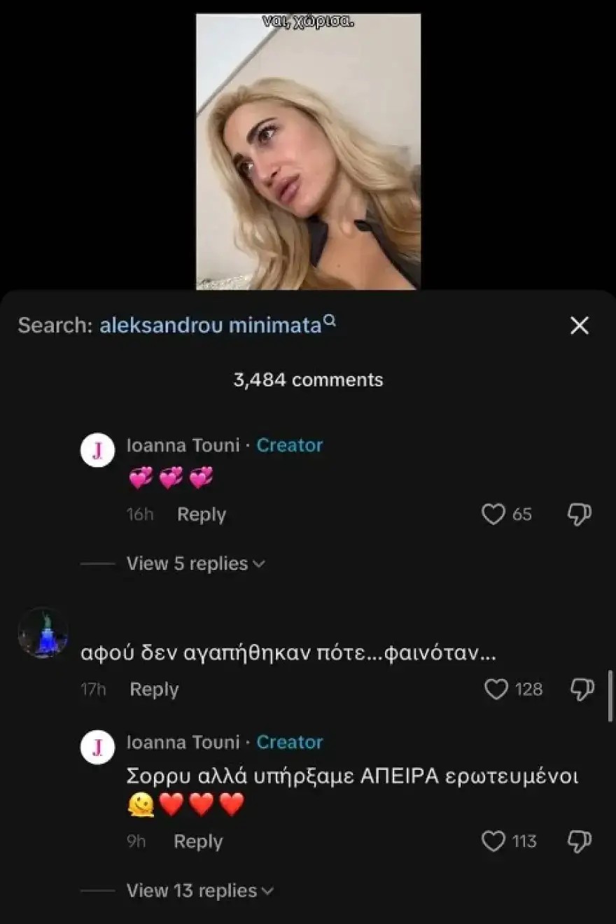 «Αφού δεν αγαπήθηκαν ποτέ, φαινόταν», σχολίασε κάποιος με την Ιωάννα Τούνη να απαντάει: «Sorry, αλλά υπήρξαμε άπειρα ερωτευμένοι».