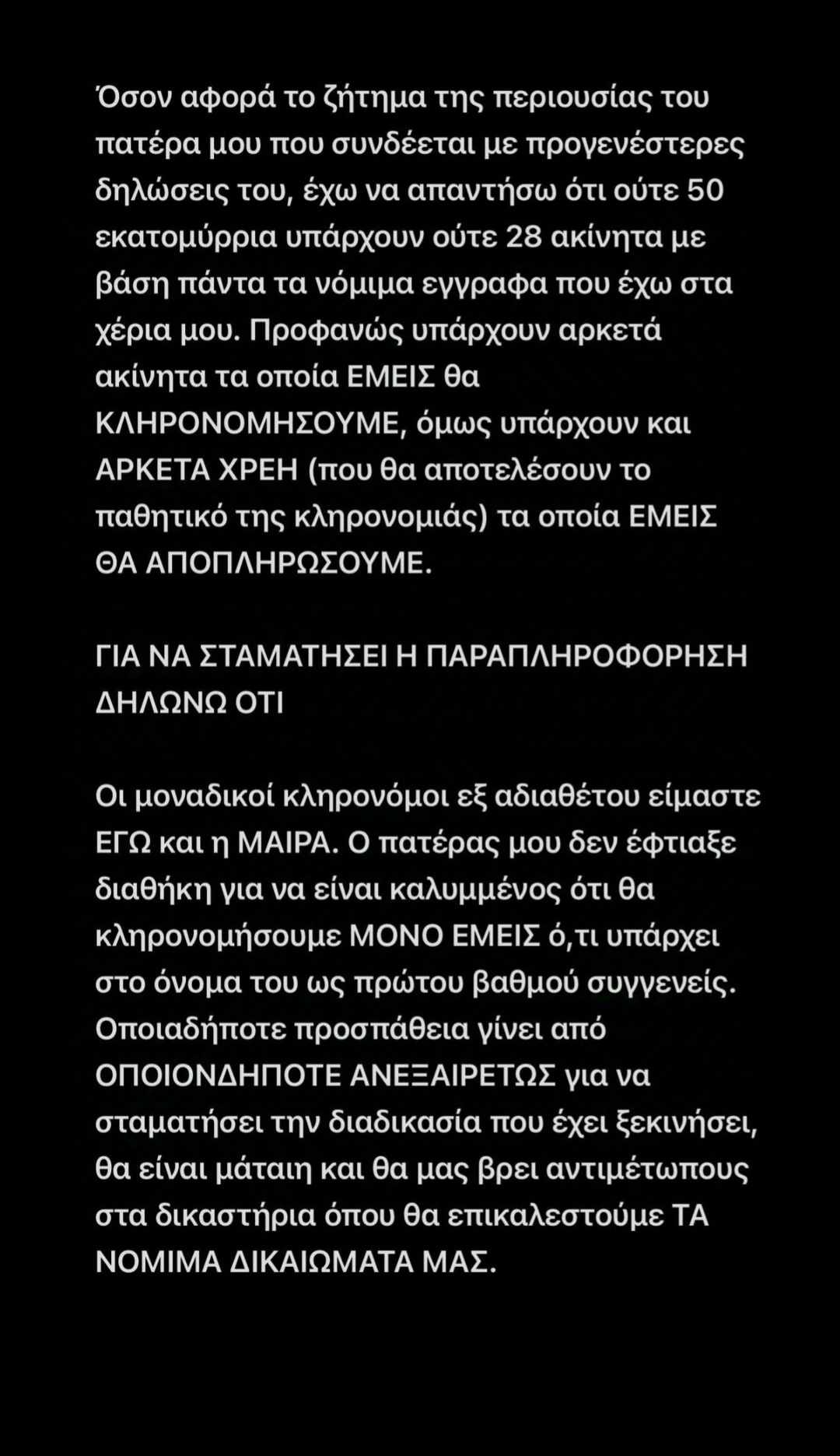 Για να σταματήσει η παραπληροφόρηση δηλώνω ότι: Οι μοναδικοί κληρονόμοι εξ αδιαθέτου είμαστε εγώ και η Μάιρα. Ο πατέρας μου δεν έφτιαξε διαθήκη για να είναι καλυμμένος ότι θα κληρονομήσουμε μόνο εμείς ό,τι υπάρχει στο όνομά του ως πρώτου βαθμού συγγενείς».