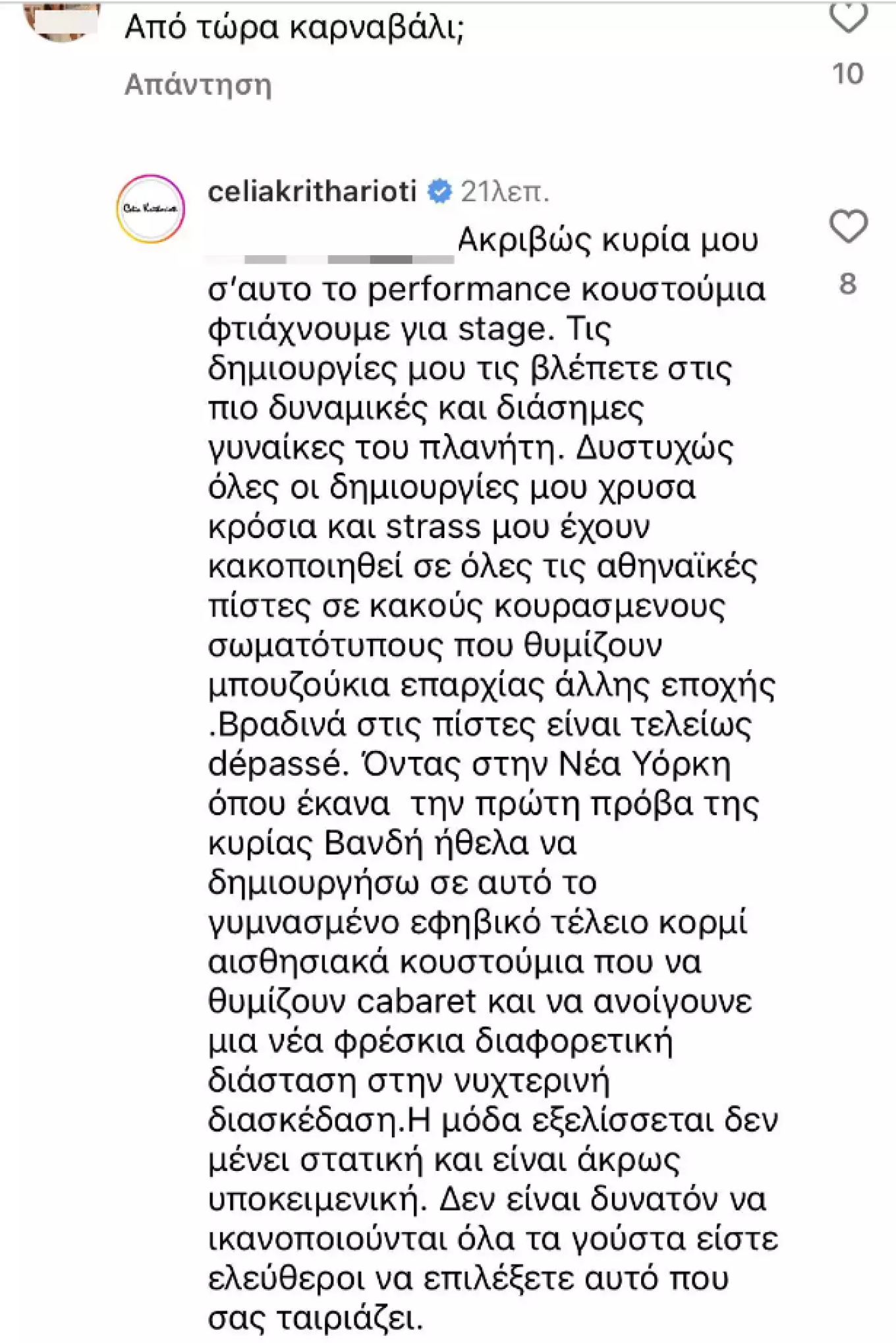 Της απάντησε: «Ακριβώς κυρία μου σ’ αυτό το performance κοστούμια φτιάχνουμε για stage. Τις δημιουργίες μου τις βλέπετε στις πιο δυναμικές και διάσημες γυναίκες του πλανήτη. Δυστυχώς όλες μου οι δημιουργίες, χρυσά κρόσσια και strass έχουν κακοποιηθεί σε όλες τις αθηναϊκές πίστες σε κακούς κουρασμένους σωματότυπους που θυμίζουν μπουζούκια επαρχίας άλλης εποχής. Βραδινά στις πίστες είναι τελείως depasse. Όντας στη Νέα Υόρκη όπου έκανα την πρώτη πρόβα της κυρίας Βανδή, ήθελα να δημιουργήσω σε αυτό το γυμνασμένο εφηβικό τέλειο κορμί αισθησιακά κοστούμια που να θυμίζουν cabaret και να ανοίγουνε μια νέα, φρέσκια, διαφορετική διάσταση στη νυχτερινή διασκέδαση. Η μόδα εξελίσσεται, δε μένει στατική και είναι άκρως υποκειμενική. Δεν είναι δυνατόν να ικανοποιούνται όλα τα γούστα, είστε ελεύθεροι να επιλέξετε αυτό που σας ταιριάζει».