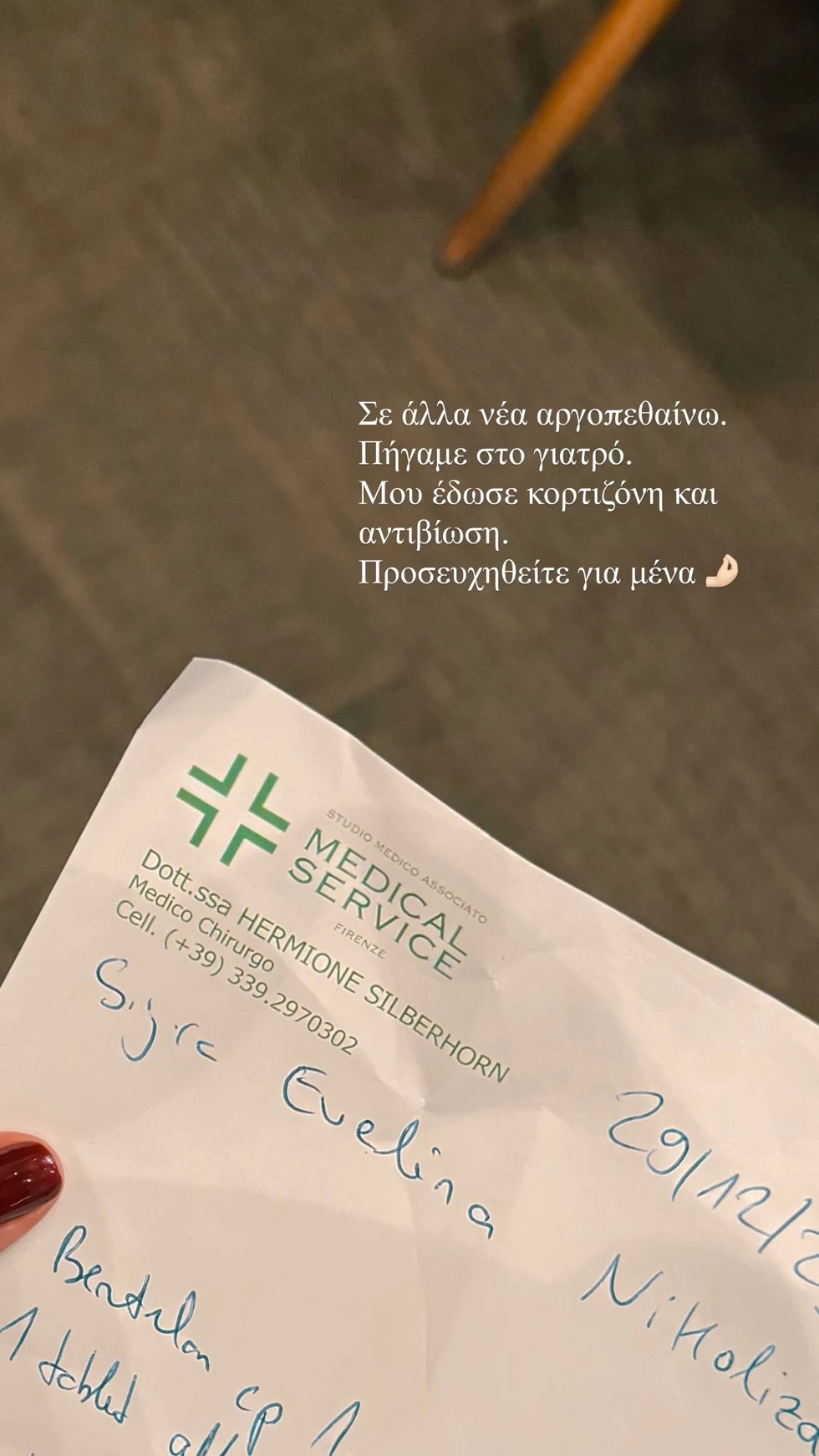 Ανάμεσα στις αναρτήσεις της, η ίδια μας έδειξε ένα χαρτί από τον γιατρό, στο οποίο ανέφερε ότι έπρεπε να πάρει κορτιζόνη για αντιβίωση. Στη συνέχεια, μοιράστηκε ένα βίντεο, στο οποίο αποκάλυψε ότι δεν συμβαίνει κάτι σοβαρό και ότι απλά έχει κλείσει η φωνή της.