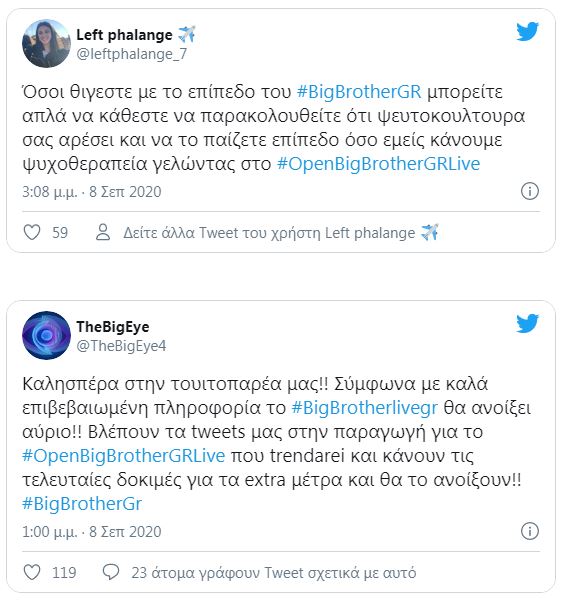 Εδώ και λίγες ώρες ωστόσο, ένα νέο hashtag διεκδικεί την κορυφή των trends. Oι χρήστες του Διαδικτύου ζητούν #OpenBigBrotherGRLive, καθώς το live streaming από το σπίτι του Μεγάλου Αδελφού δεν έχει επανέλθει στη διαδικτυακή πλατφόρμα του ΣΚΑΪ.