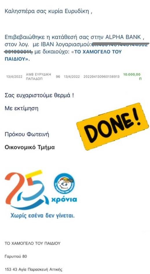 Η ίδια ανέβασε φωτογραφία από το μήνυμα που έλαβε, όπου επιβεβαιωνόταν η δωρεά της, λίγο καιρό μετά την αποχώρησή της από το ριάλιτι.