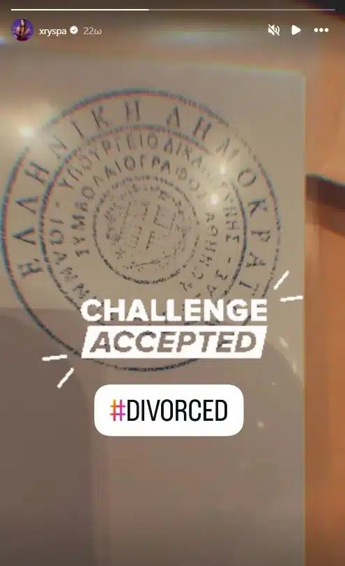 Σε ανάρτησή της χθες το μεσημέρι, η Χρύσπα μοιράστηκε στα Insta stories της ένα βίντεο που δείχνει τα χαρτιά διαζυγίου της, γράφοντας «Challenge accepted #Divorced».