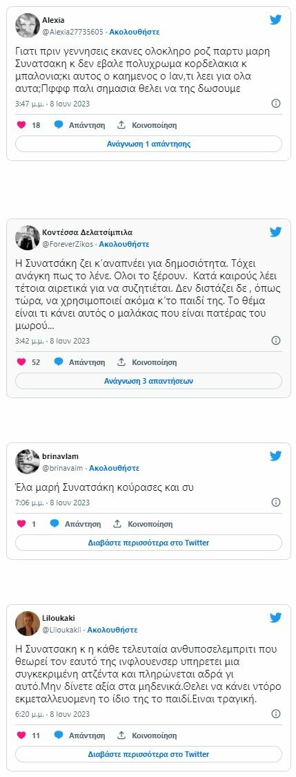 Η Μαίρη Συνατσάκη δήλωσε πρόσφατα ότι το παιδί της είναι βιολογικά κορίτσι, αλλά θα αποφασίσει το ίδιο το παιδί το κοινωνικό του φύλο. Αυτή η δήλωση προκάλεσε έντονες αντιδράσεις στα μέσα κοινωνικής δικτύωσης.