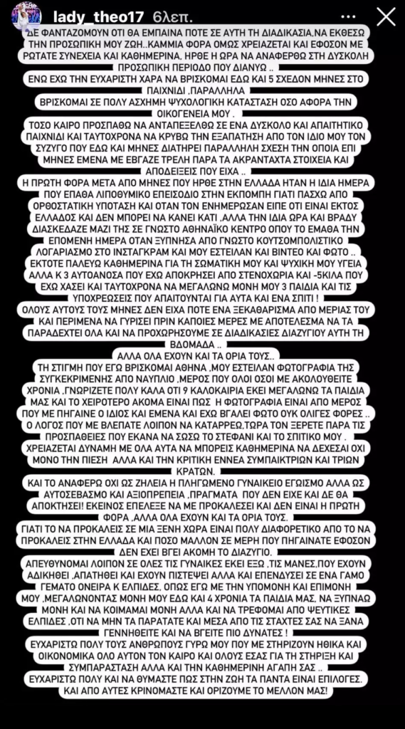 «Και ταυτόχρονα να μεγαλώνω μόνη μου τρία παιδιά, και τις υποχρεώσεις που απαιτούνται για αυτά και ένα σπίτι. Όλους αυτούς τους μήνες δεν είχα ποτέ ένα ξεκαθάρισμα από μεριάς του και περίμενα να γυρίσει πριν κάποιες μέρες με αποτέλεσμα να τα παραδεχτεί όλα και να προχωρήσουμε σε διαδικασίες διαζυγίου αυτή την εβδομάδα. Όλα έχουν και τα όρια τους. Τη στιγμή που εγώ βρίσκομαι Αθήνα, μου έστειλαν φωτογραφία της συγκεκριμένης από Ναύπλιο, μέρος που όλοι όσοι με ακολουθείτε χρόνια γνωρίζετε πολύ καλά ότι εννιά καλοκαίρια εκεί μεγαλώνουν τα παιδιά μας.