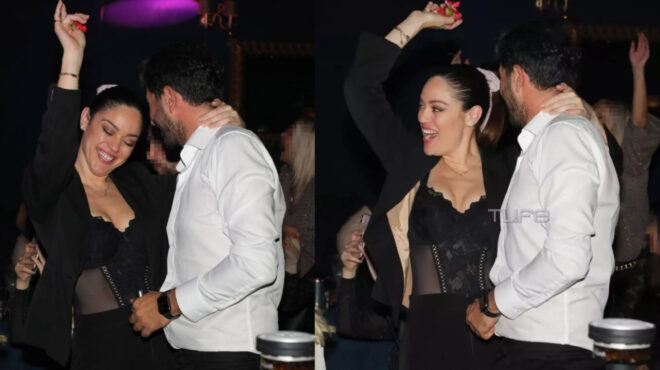 Δεν σταματούσε να χορεύει και να αγκαλιάζει τον σύντροφό της ενώ δεν σταμάτησαν οι δυο τους να ανταλλάσουν παθιασμένα φιλιά παρ’ όλο που είχαν αντιληφθεί την παρουσία φωτογραφικού φακού.
