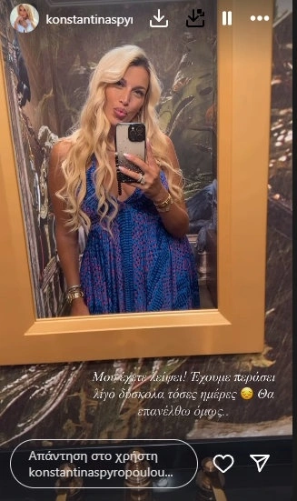 «Μου έχετε λείψει! Έχουμε περάσει δύσκολα τόσες ημέρες. Θα επανέλθω όμως», έγραψε χαρακτηριστικά στην ανάρτησή της η Κωνσταντίνα Σπυροπούλου, χωρίς ωστόσο να δίνει περισσότερες πληροφορίες για τον λόγο της απουσίας της.