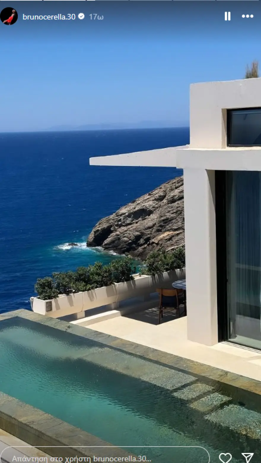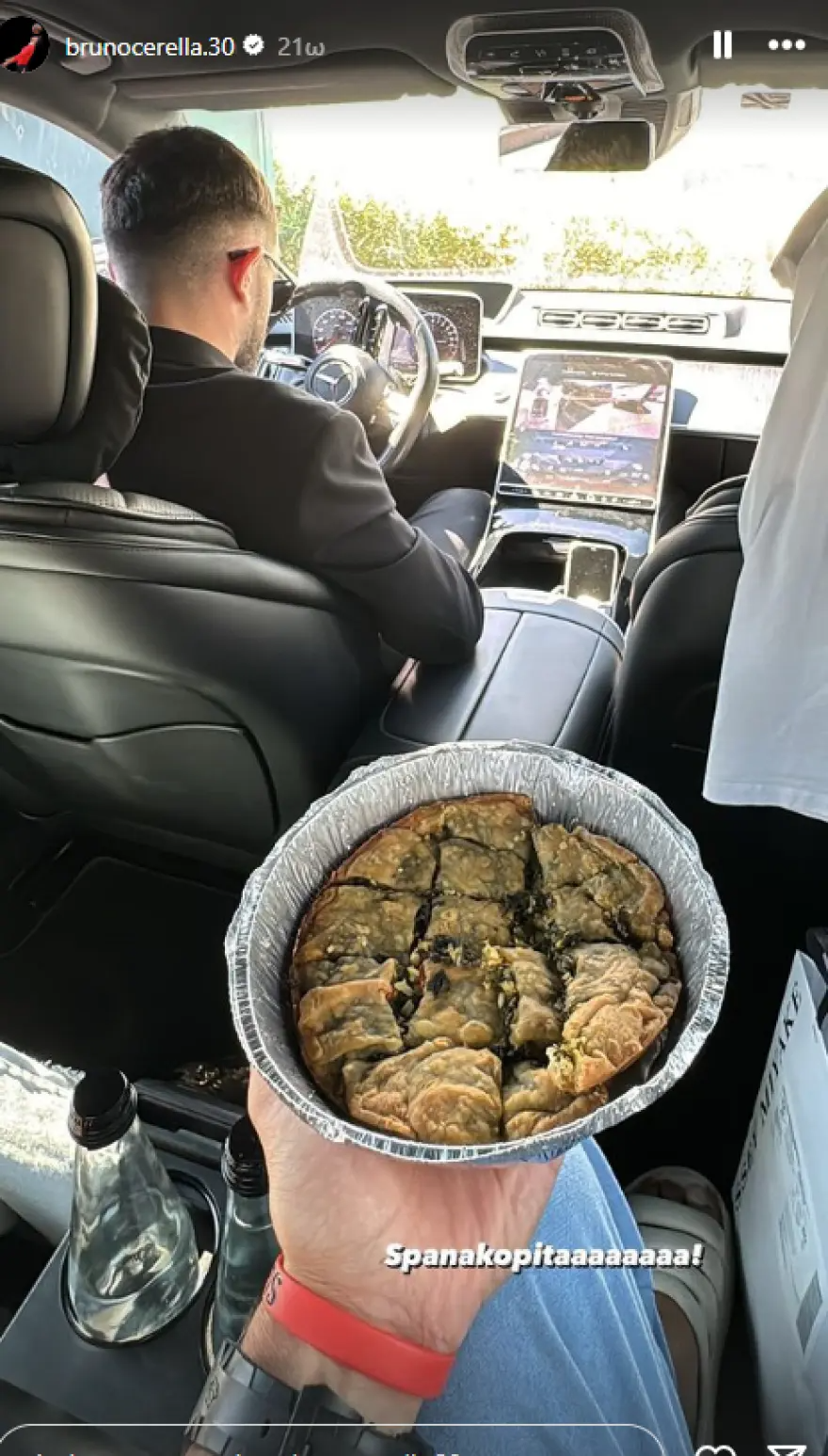 Από τον δικό του λογαριασμό, ο Μπρούνο Τσερέλα δημοσίευσε αρχικά μια φωτογραφία του μέσα στο αυτοκίνητο που ταξιδεύει με προορισμό το νησί, στην οποία αποθεώνει ένα ταψί σπανακόπιτα, ενώ ακολούθησαν και άλλες από τα μπάνια του στη θάλασσα και την πισίνα, αλλά και από το μέρος διαμονής τους.