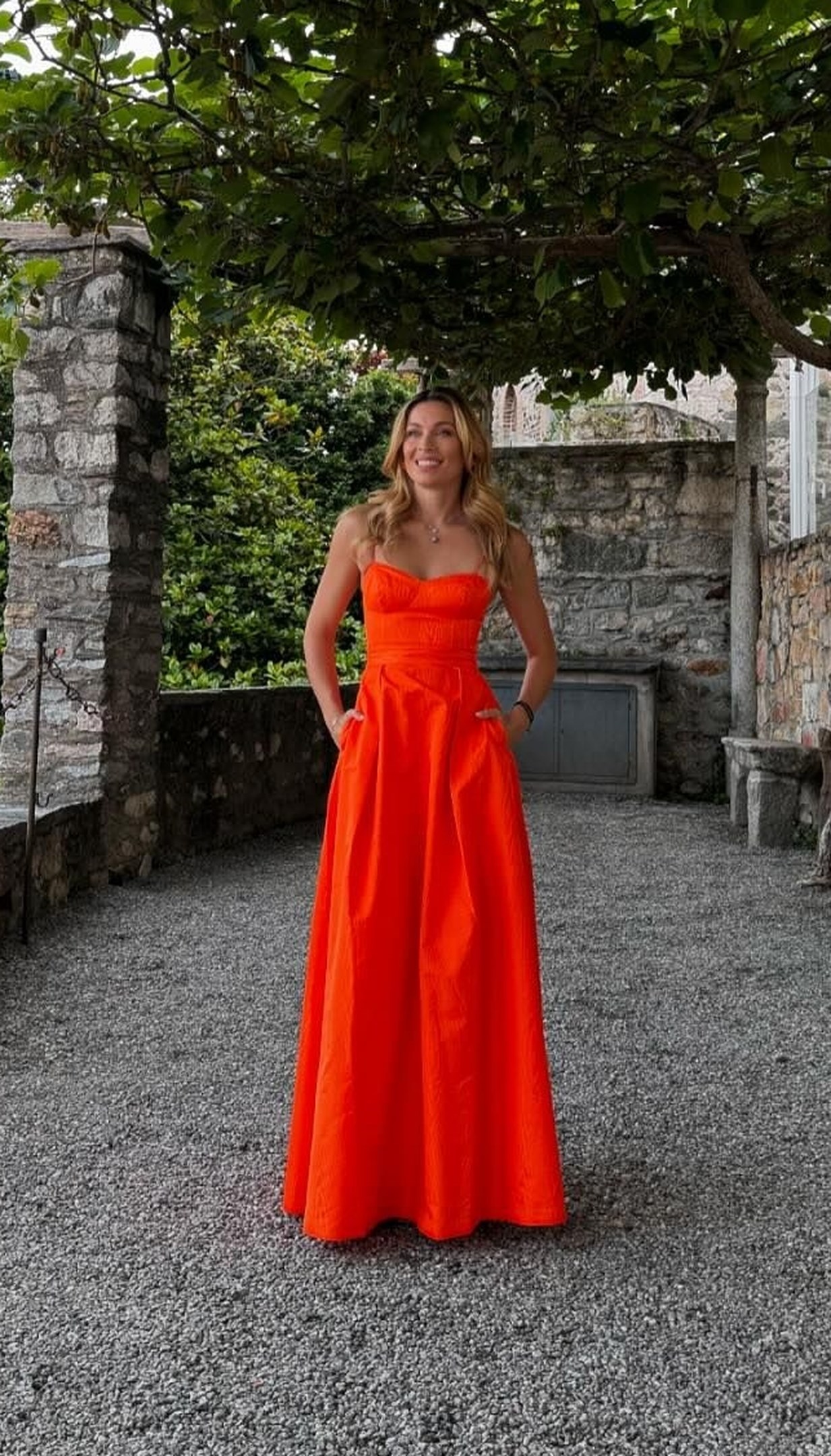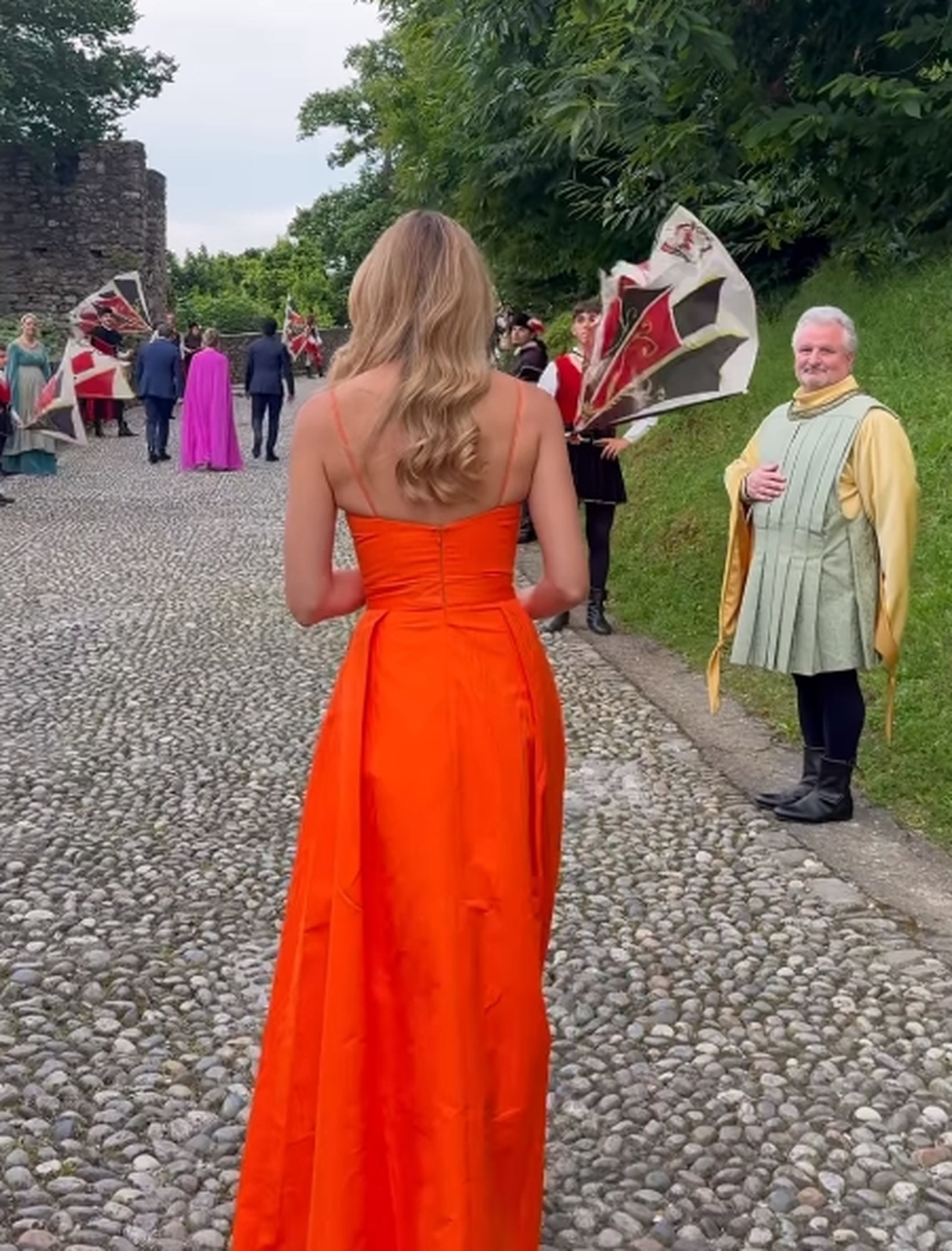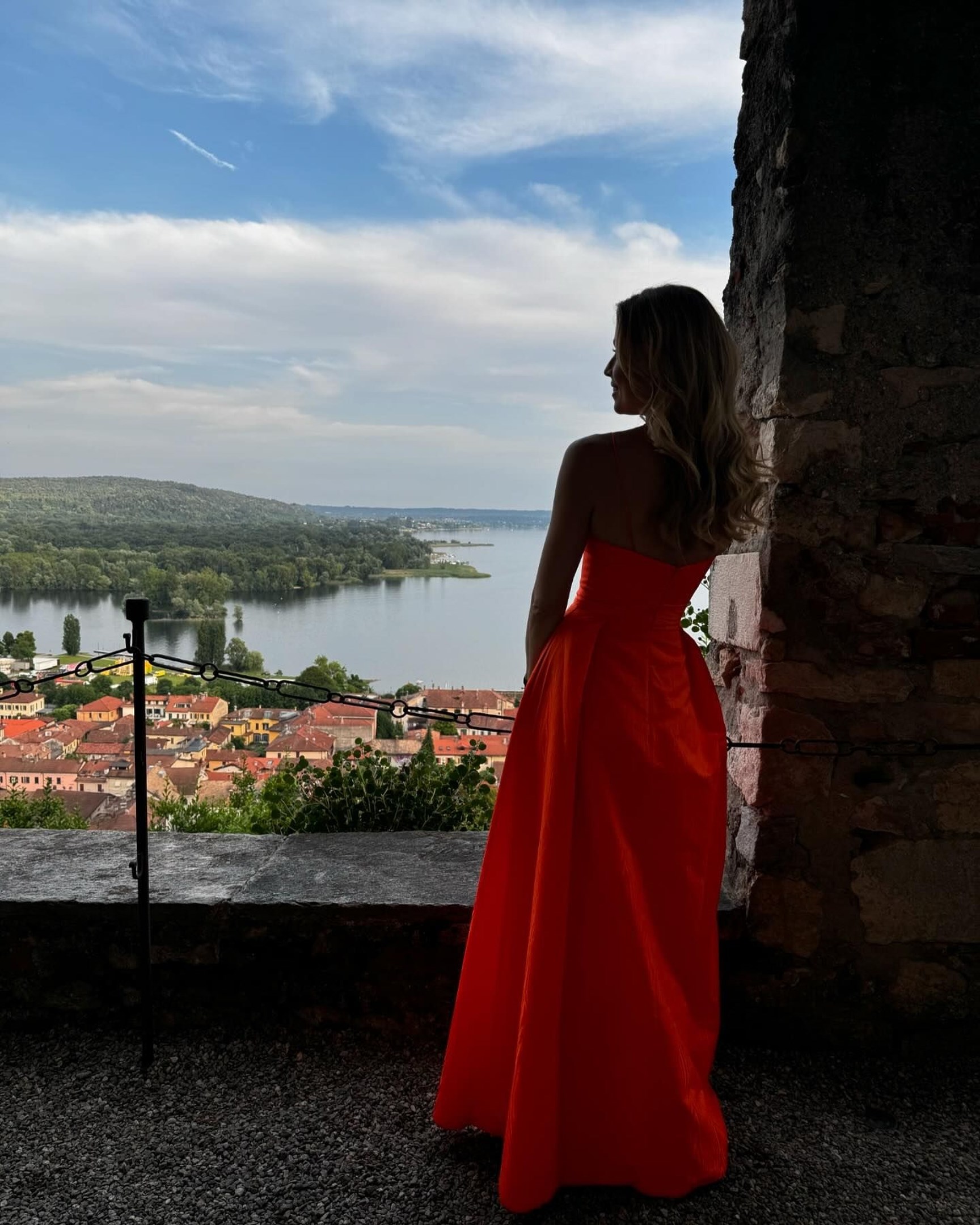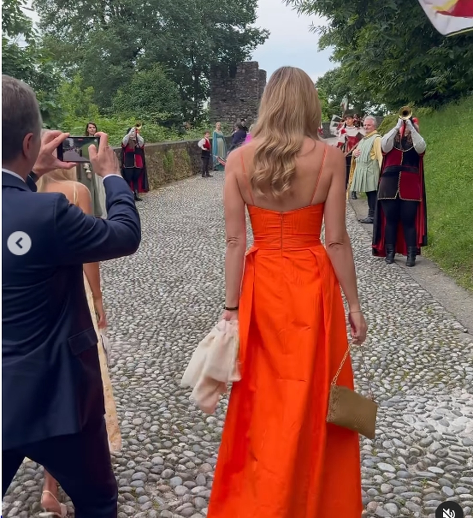 Έτσι το ζευγάρι ταξίδεψε προς την υπέροχη αυτή λίμνη για να παραβρεθεί στον γάμο. Η Χρουσαλά επέλεξε ένα κομψό φόρεμα neon πορτοκαλί, με λεπτές τιράντες που εφάρμοζαν στο πάνω μέρος της και μια φαρδιά φούστα που έφτανε μέχρι το πάτωμα. Και στην φωτογραφία που δημοσίευσε έγραψε: “Beautiful day in Lago Maggiore!”