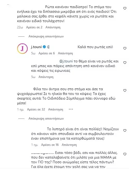 Πολλοί ήταν αυτοί που έτρεξαν να επικρίνουν την Ιωάννα Τούνη γι’ αυτή της την ενέργεια, καθώς – σύμφωνα με όσα υποστηρίζουν – θεωρείται ότι παραβιάζει τα προσωπικά όρια του παιδιού και μπορεί να του μεταδώσει διάφορα μικρόβια μέσω αυτών των φιλιών. Ενώ δεν έλειψαν και οι αναφορές περί Οιδιπόδειο σύμπλεγμα. Φυσικά, η Ιωάννα Τούνη απάντησε σε αυτά τα σχόλια.