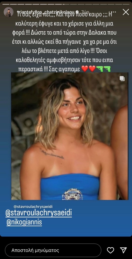 Το spoiler για την αποχώρηση της Σταυρούλας Χρυσαειδή επιβεβαίωσε με ανάρτησή του στον προσωπικό του λογαριασμό στο Instagram και ο Τριαντάφυλλος.