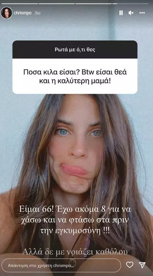 Η Χριστίνα Μπόμπα σε ερώτηση για την ηλικία της απάντησε πως πρόσφατα έκλεισε τα 34, ενώ σχετικά με το βάρος της, η ίδια ανέφερε πως ζυγίζει 66 κιλά, ωστόσο θέλει να χάσει άλλα 8 προκειμένου να επιστρέψει στα κιλά που ήταν πριν μείνει έγκυος στις δίδυμες.