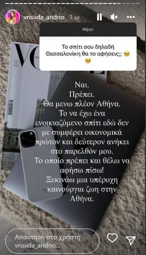 Η Βρισηίδα Ανδριώτου φαίνεται πως κάνει ένα νέο βήμα στην ζωή της, καθώς όπως αποκάλυψε θα φύγει από τη Θεσσαλονίκη και θα μετακομίσει στην Αθήνα.