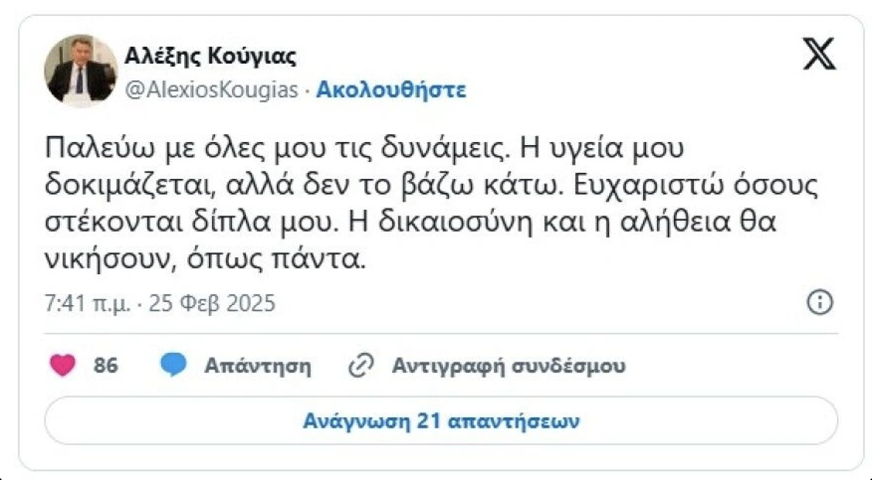 Με ανάρτησή του, ο 23χρονος Χρήστος Κούγιας τόνισε πως ο πατέρας του δεν διατηρεί κανέναν λογαριασμό στα social media. Παράλληλα, ζήτησε από τα Μέσα Ενημέρωσης να μην λαμβάνουν υπόψη τους ψεύτικους λογαριασμούς που κυκλοφορούν στο διαδίκτυο.