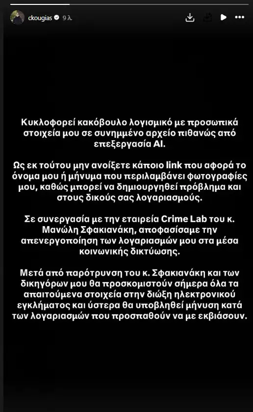 Όπως επισημαίνει στην ανάρτηση που κοινοποιήθηκε στο Instagram, κυκλοφορεί κακόβουλο λογισμικό με τα προσωπικά του στοιχεία και έτσι αποφάσισε να προχωρήσει στην απενεργοποίηση τον λογαριασμό του στα μέσα κοινωνικής δικτύωσης.