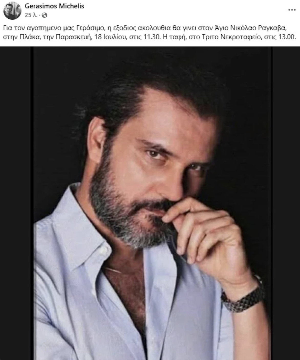 «Για τον αγαπημένο μας Γεράσιμο, η εξόδιος ακολουθία θα γίνει στον Άγιο Νικόλαο Ραγκαβά, στην Πλάκα, την Παρασκευή, 18 Ιουλίου, στις 11.30. Η ταφή, στο Τρίτο Νεκροταφείο, στις 13.00», γράφει η λεζάντα της δημοσίευσης.