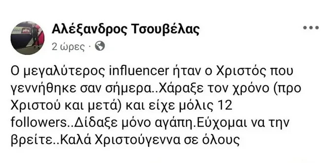 «Ο μεγαλύτερος influencer ήταν ο Χριστός που γεννήθηκε σαν σήμερα… Χάραξε τον χρόνο (προ Χριστού και μετά) και είχε μόλις 12 followers… Δίδαξε μόνο αγάπη. Εύχομαι να τη βρείτε. Καλά Χριστούγεννα σε όλους», είχε γράψει στο Facebook ο Αλέξανδρος Τσουβέλας στην ανάρτηση που έκανε το πρωί της Πέμπτης (25.12.2025).