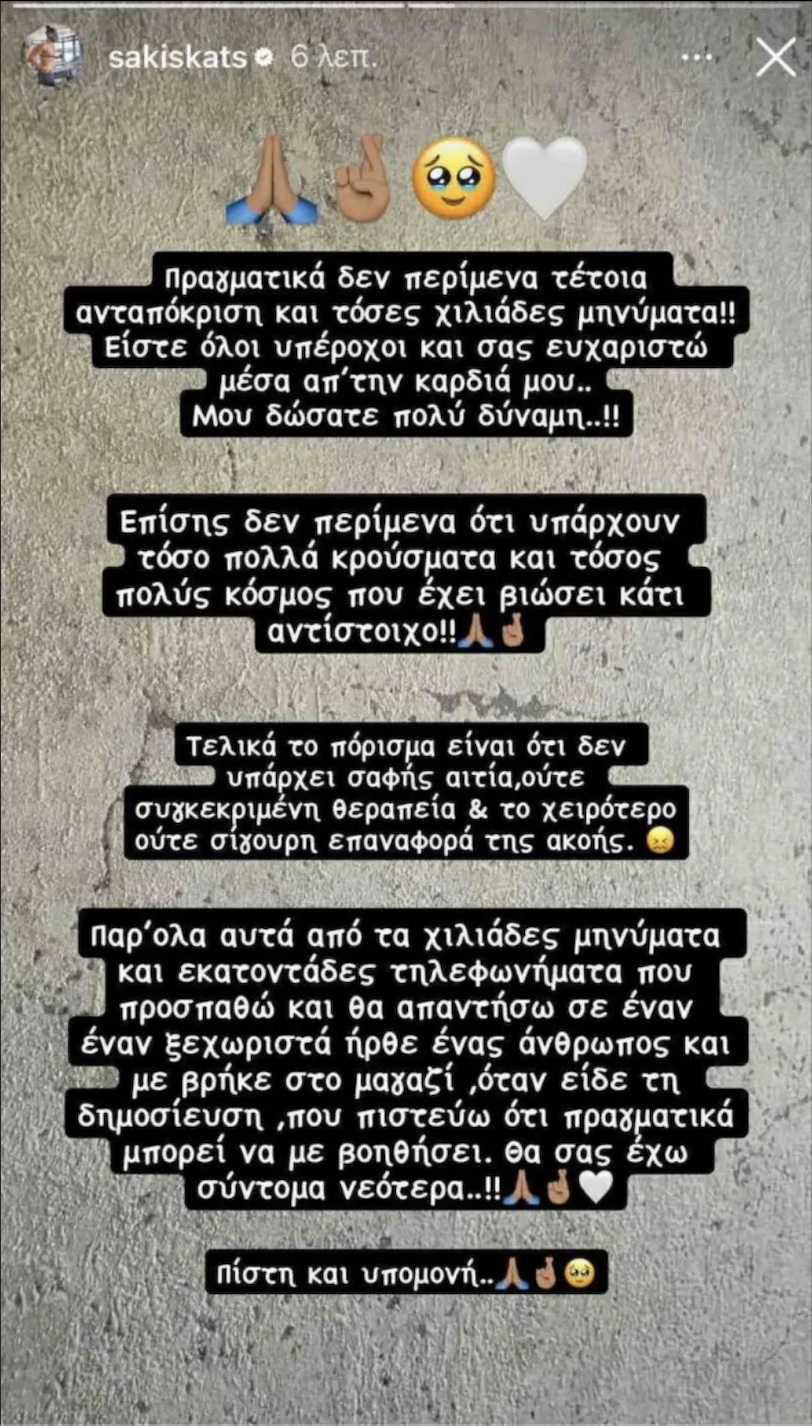 Ο Σάκης Κατσούλης μετά την αποκάλυψη του προβλήματος που αντιμετωπίζει, θέλησε να ευχαριστήσει τους διαδικτυακούς του φίλους για το ενδιαφέρον που έδειξαν σχετικά με την κατάσταση της υγείας του, τονίζοντας πως δεν περίμενε τέτοια ανταπόκριση:
