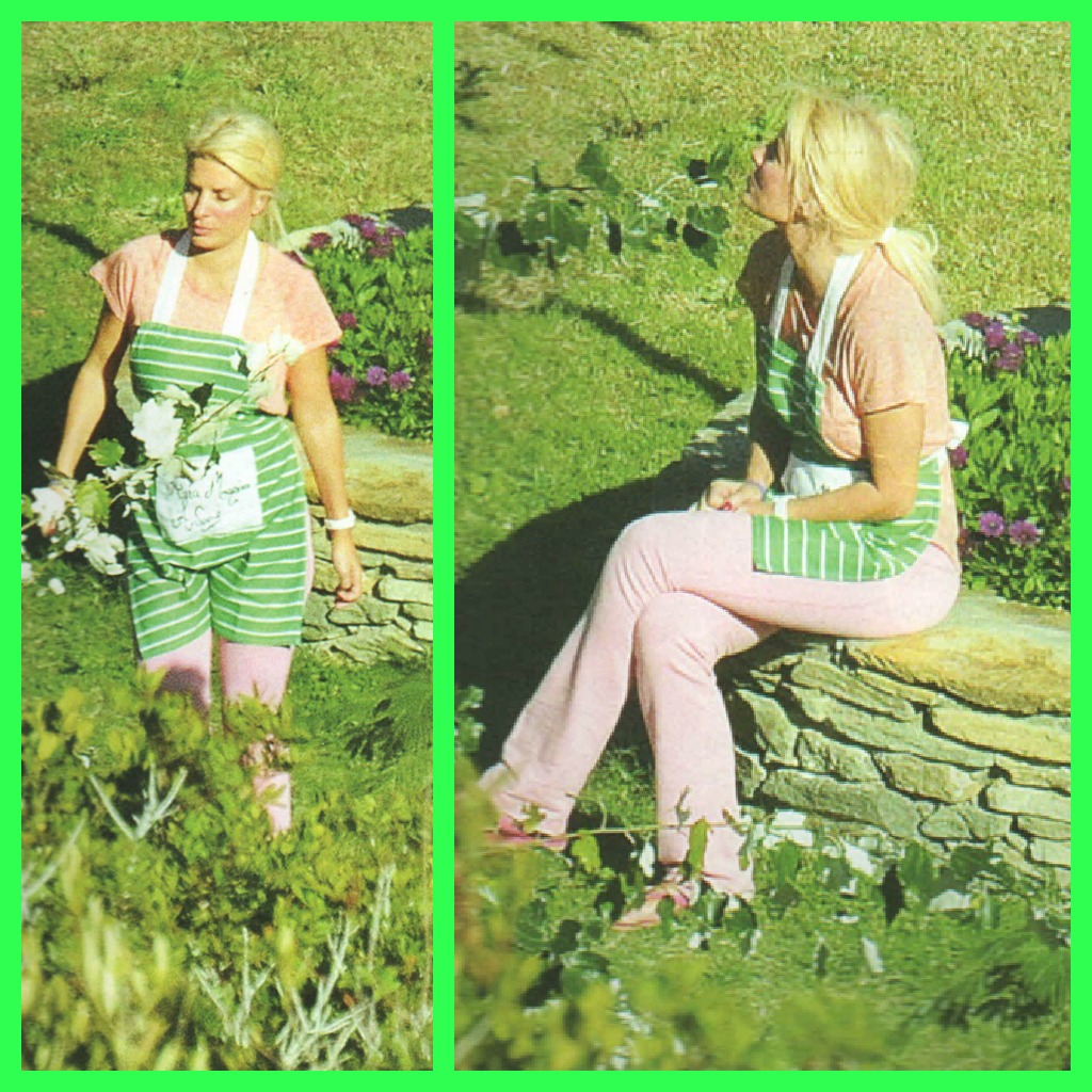 Η Ελένη προσπαθεί να μαζέψει λουλούδια από τον κήπο της ξενοδοχειακής μονάδας του συζύγου της, φορώντας τα απαραίτητα ρούχα για να πραγματοποιήσει τη συγκεκριμένη εργασία.
