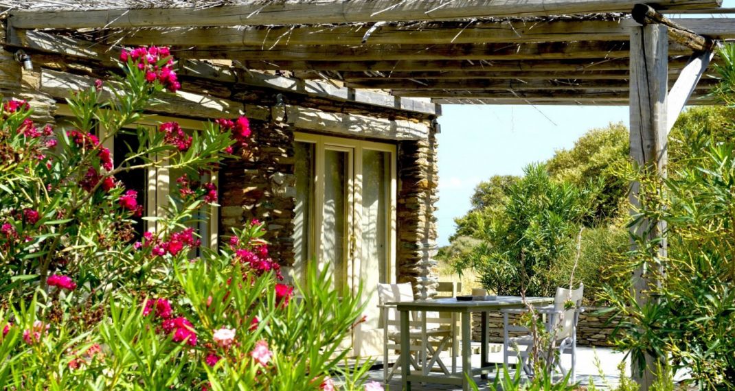 Η εξωτερική όψη της ξενοδοχειακής μονάδας του Μάκη Παντζόπουλου, μαζί με τον κήπο που διαθέτει. Στη δεξιά πλευρά της φωτογραφίας διακρίνεται και ο σκύλος του γνωστού επιχειρηματία.