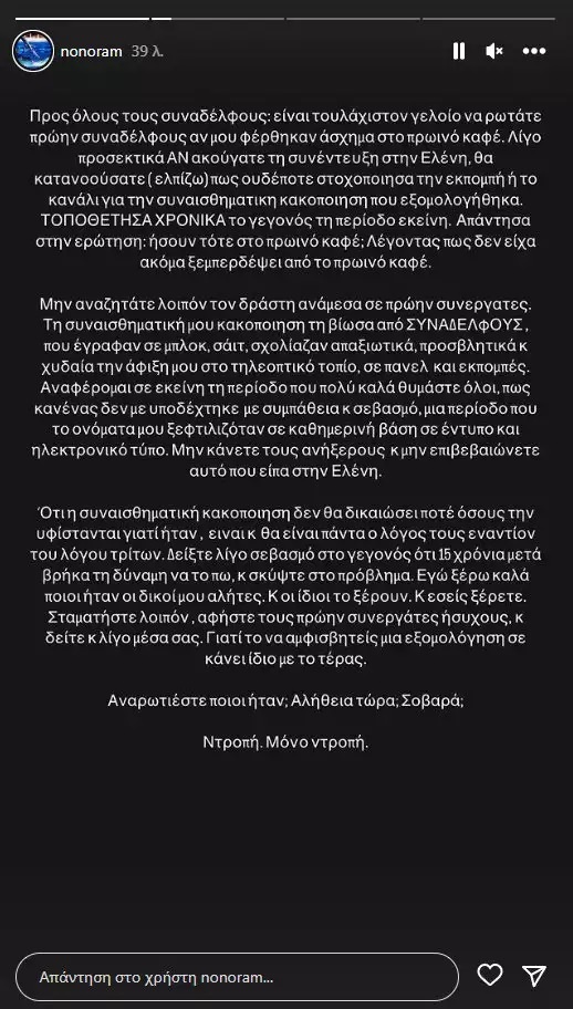 «Προς όλους του συναδέλφους, είναι τουλάχιστον γελοίο να ρωτάτε πρώην συναδέλφους αν μου φέρθηκαν άσχημα στον Πρωινό Καφέ. Λίγο προσεκτικά αν ακούγατε τη συνέντευξή μου στην Ελένη Μενεγάκη θα κατανοούσατε (ελπίζω) πως ουδέποτε στοχοποίησα την εκπομπή ή το κανάλι για τη συναισθηματική κακοποίηση που εξομολογήθηκα.