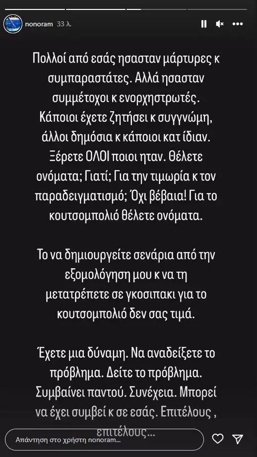 Στη συνέχεια η παρουσιάστρια πρόσθεσε: «Η συναισθηματική κακοποίηση δεν θα δικαιώσει ποτέ όσους την υφίστανται γιατί ήταν, είναι και θα είναι πάντα ο λόγος εναντίον του λόγου τρίτων. Δείξτε λίγο σεβασμό στο γεγονός ότι 15 χρόνια μετά βρήκα τη δύναμη να το πω και σκύψτε στο πρόβλημα. Εγώ ξέρω καλά ποιοι ήταν οι δικοί μου οι αλήτες. Και οι ίδιοι το ξέρουν και εσείς το ξέρετε. Σταματήστε λοιπόν, αφήστε τους πρώην συνεργάτες ήσυχους και δείτε λίγο μέσα σας. Γιατί το να αμφισβητείς μια εξομολόγηση σε κάνει ίδιο με το τέρας. Αναρωτιέστε ποιοι ήταν; Αλήθεια τώρα; Σοβαρά; Ντροπή. Μόνο ντροπή», έγραψε η Ελεονώρα Μελέτη.