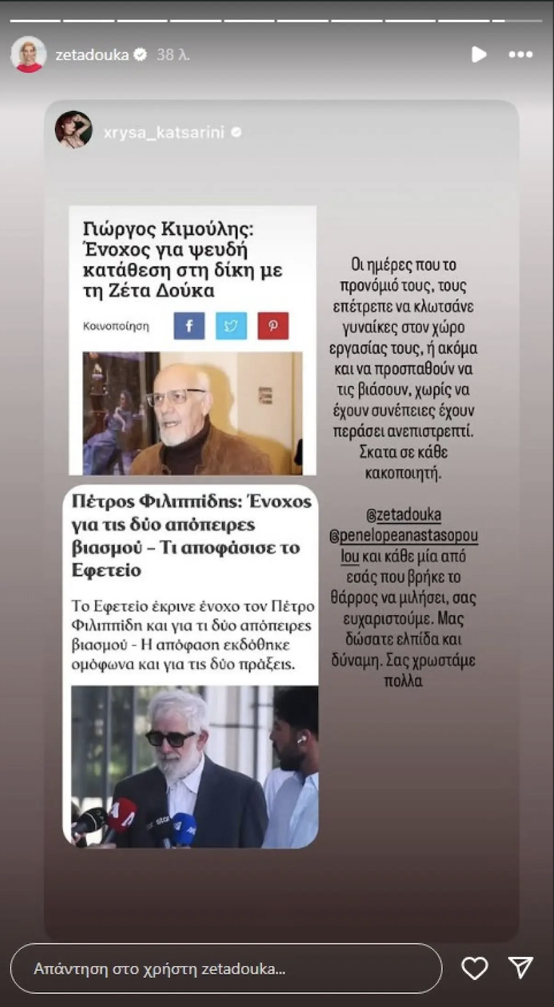Μετά την ανακοίνωση της απόφασης, οι δύο γυναίκες που κατήγγειλαν τον ηθοποιό ξεσπούν σε λυγμούς, ενώ στο ακροατήριο βρίσκονταν και οι Άννα – Μαρία Παπαχαραλάμπους και Λένα Δροσάκη, που στήριξαν με θάρρος τη διαδικασία. Παρών και ο Σπύρος Μπιμπίλας, που παρακολουθούσε συγκινημένος τις εξελίξεις.