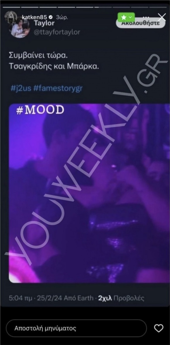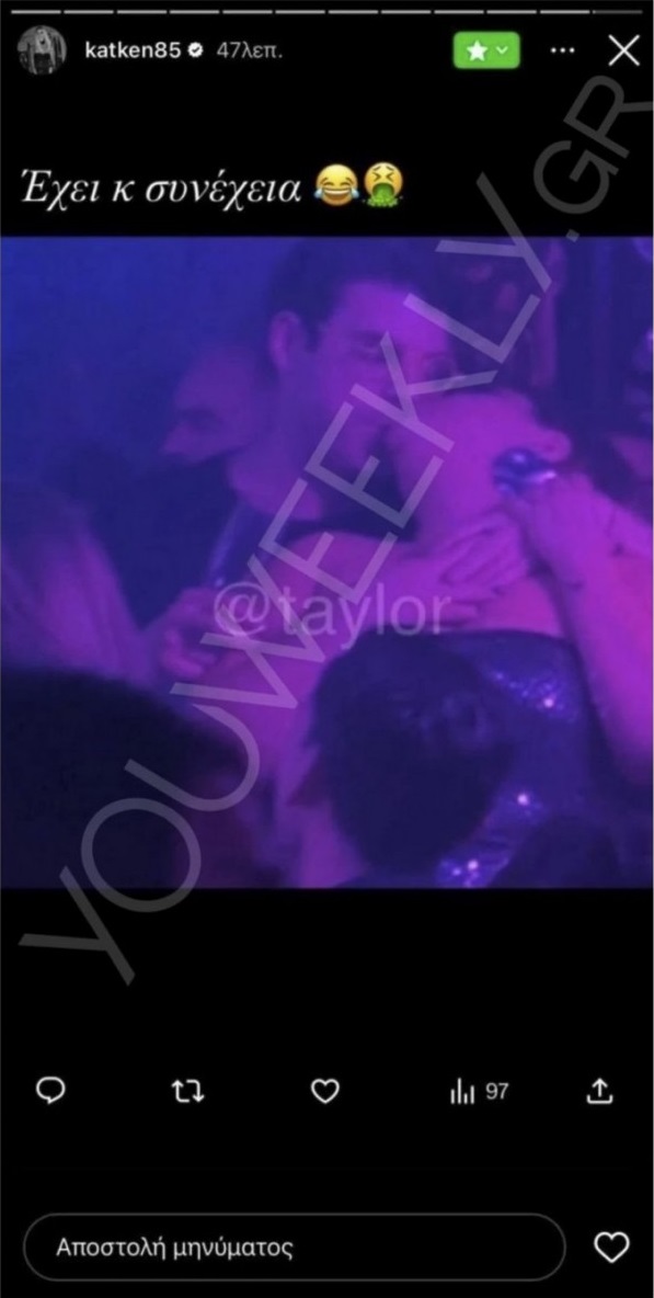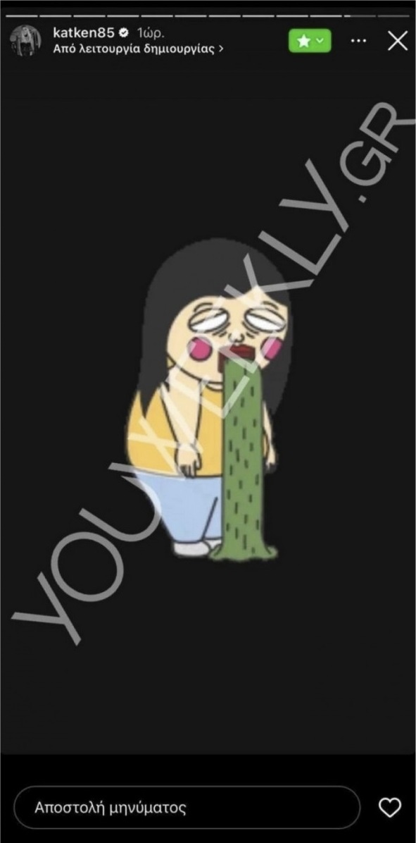 Σε αυτές, η ίδια είχε κοινοποιήσει τη φωτογραφία, στην οποία Τσαγκρίδης και Μπάρκα φιλιούνται σε γνωστό κλαμπ του κέντρου της Αθήνας μαζί με ένα emoji εμετού, ενώ λίγο αργότερο προχώρησε στην κοινοποίηση ακόμα ενός gif με ένα ανθρωπάκι που φαίνεται να κάνει εμετό.
