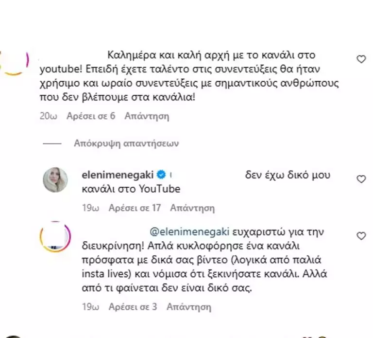 «Δεν έχω δικό μου κανάλι στο YouTube» απάντησε στο πρώτο σχόλιο η Ελένη Μενεγάκη και συνέχισε σε άλλη απάντηση: «Δεν είναι δικό μου! Καμία σχέση».