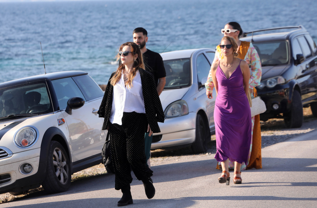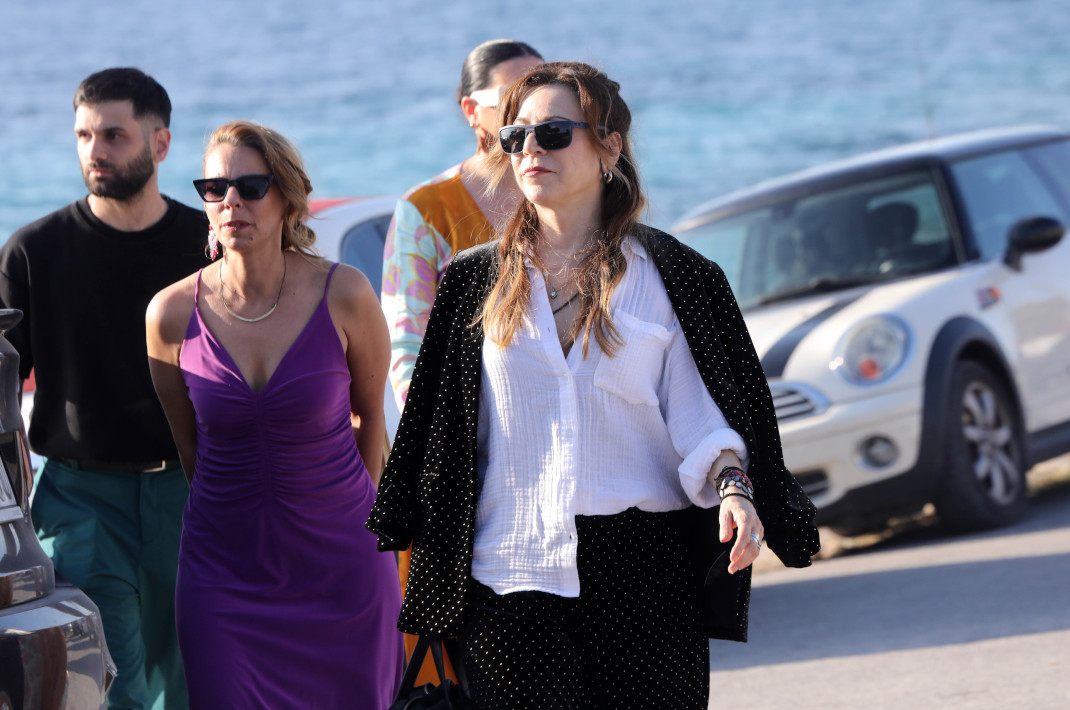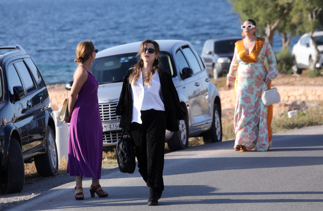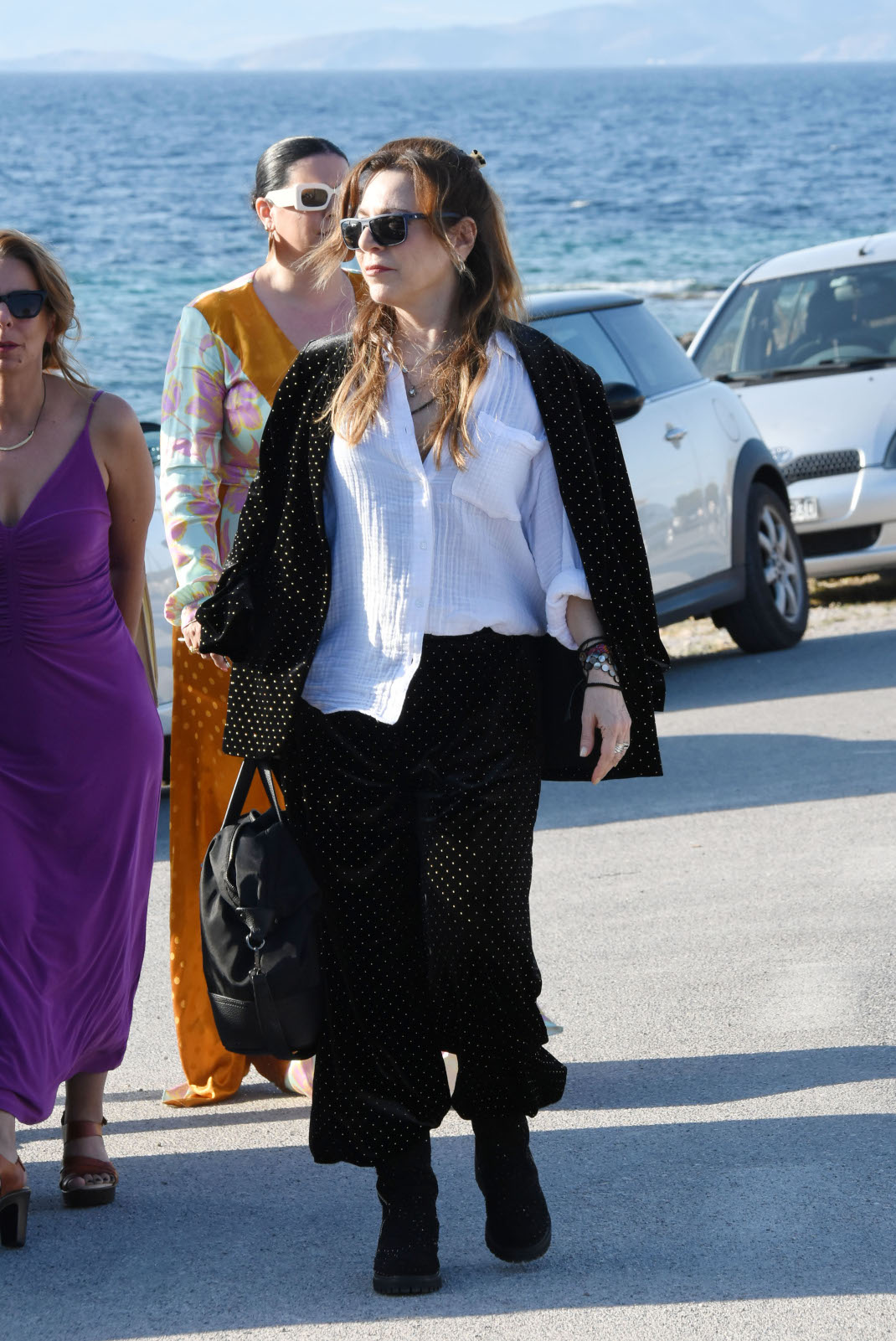O φωτογραφικός φακός του NDP εντόπισε μεταξύ άλλων την Δήμητρα Παπαδοπούλου να φτάνει στην εκκλησία φορώντας ένα μαύρο πουά κοστούμι και μαύρα μποτάκια. Από μέσα επέλεξε ένα λευκό λινό πουκάμισο και μαύρα γυαλιά ηλίου που ταιριάζει ιδανικά σε έναν καλοκαιρινό γάμο σε νησί.