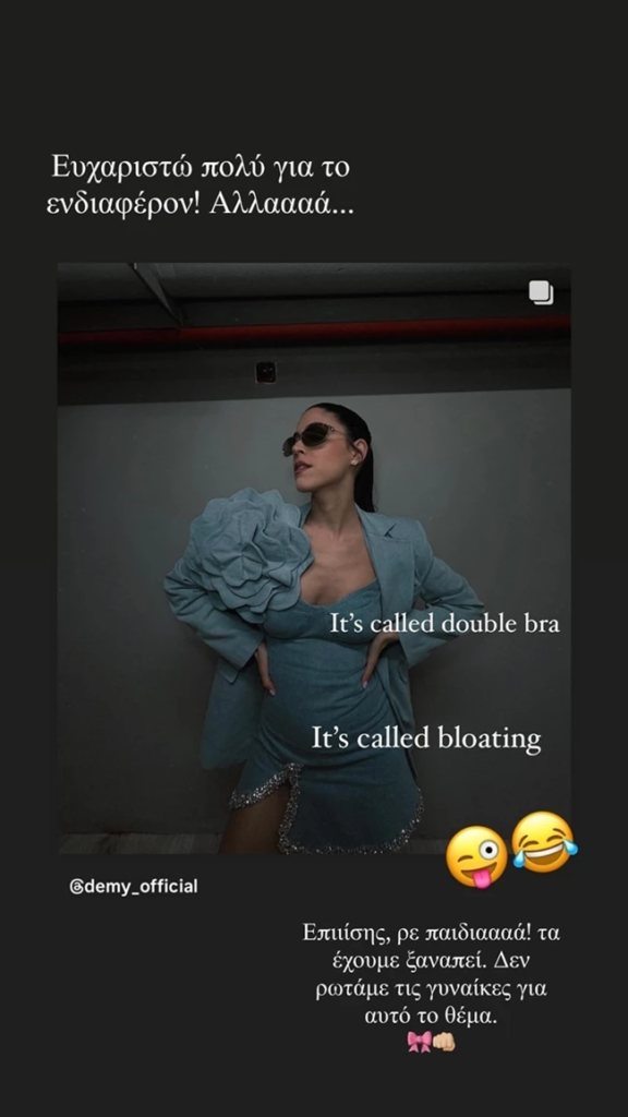 Η ίδια, το βράδυ της Τετάρτης, θέλησε να ξεκαθαρίσει τα πράγματα και να διαψεύσει την είδηση ότι είναι έγκυος. Έτσι δημοσίευσε ξανά τη φωτογραφία και έγραψε στο insta story της ότι: “Ευχαριστώ πολύ για το ενδιαφέρον, αλλά… ονομάζεται διπλή ενίσχυση και φούσκωμα. Επίσης ρε παιδιά. Τα έχουμε ξαναπεί. Δεν ρωτάμε τις γυναίκες για αυτό το θέμα”.