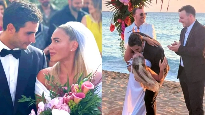 Μετά τους δύο γάμους στα Φαλάσαρνα της Κρήτης, το ζευγάρι διοργάνωσε ένα ξέφρενο beach party όπου χόρεψαν, τραγούδησαν και διασκέδασαν μέχρι τις πρώτες πρωινές ώρες της Κυριακής.