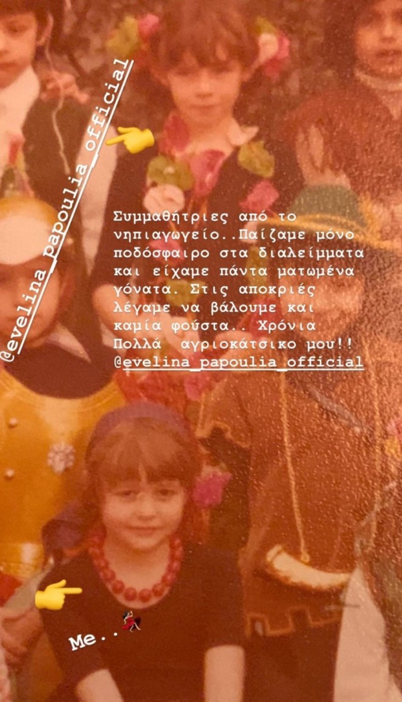 «Συμμαθήτριες από το νηπιαγωγείο. Παίζαμε μόνο ποδόσφαιρο στα διαλείμματα και είχαμε πάντα ματωμένα γόνατα… Στις Απόκριες λέγαμε να βάλουμε και καμιά φούστα… Χρόνια πολλά αγριοκάτσικό μου!!»
