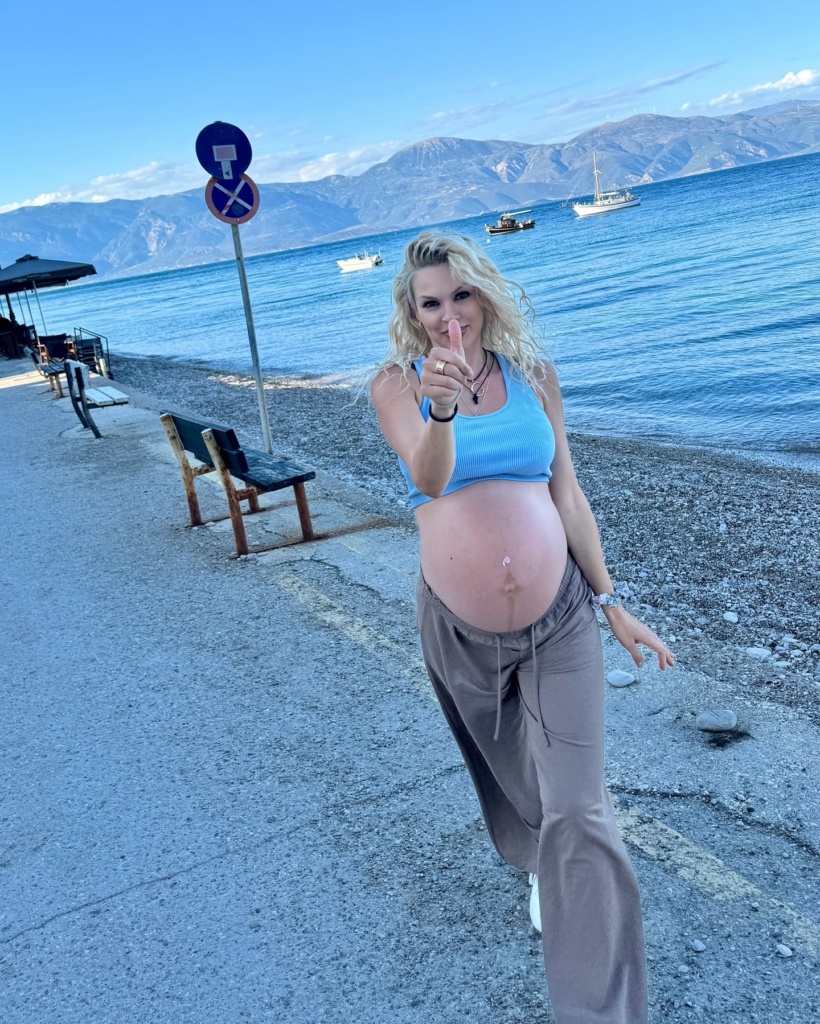 Παρά την προχωρημένη φάση της εγκυμοσύνης της, η Βίκυ Κάβουρα συνεχίζει τις καθημερινές της δραστηριότητες με αφοσίωση, συμπεριλαμβανομένης της γυμναστικής, ενώ απολαμβάνει τις ήρεμες βόλτες στον παραλιακό περίπατο.