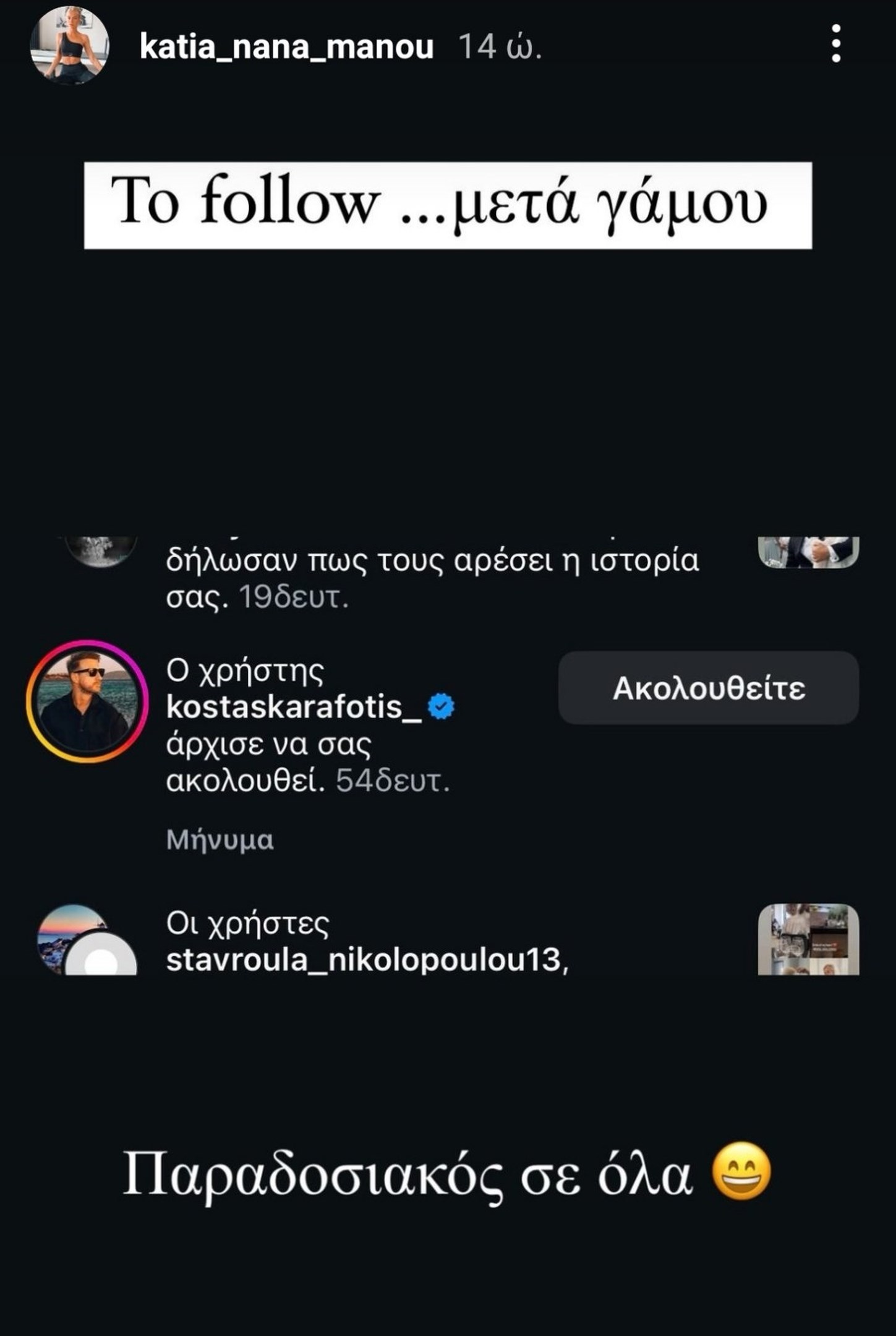 «Παραδοσιακός σε κάθε του πράξη», αναφέρει η Κάτια Μάνου, πλέον σύζυγος του Κώστα Καραφώτη, ο οποίος την ακολούθησε στο Instagram αμέσως μετά τον γάμο τους.