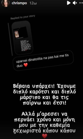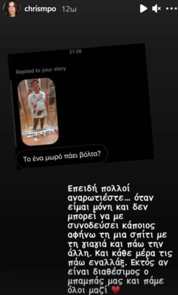 Η Χριστίνα Μπόμπα απάντησε ότι όταν δεν μπορεί ο Σάκης αφήνει τη μία κόρη στη γιαγιά της και βγαίνει με την άλλη. Αν και έχουν διπλό καρότσι, η Μπόμπα τόνισε ότι προτιμά κάποιες φορές να περνάει ξεχωριστό χρόνο με την καθεμιά από τις κόρες της. Έτσι τις πηγαίνει βόλτα εναλλάξ!
