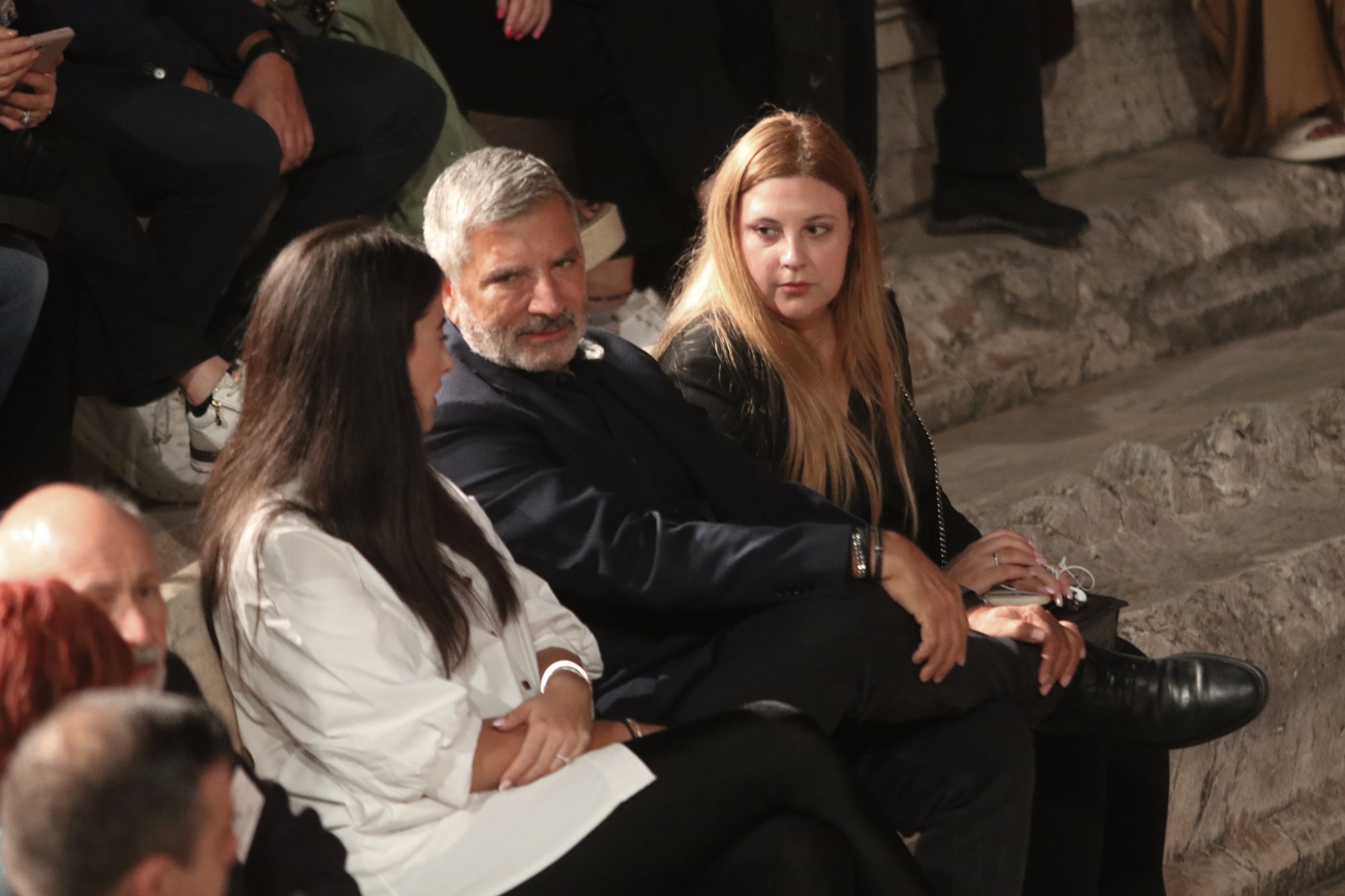 Καθισμένοι στην πρώτη σειρά, ο Γιώργος Πατούλης και η κατά 30 χρόνια νεότερη σύντροφός του, τράβηξαν τα βλέμματα. Η Νάνσυ Κοίλου επέλεξε να φορέσει μαύρο παντελόνι και ένα λευκό oversized σακάκι, που έκρυβε τη φουσκωμένη κοιλιά της. Τα μαλλιά της ήταν μακριά και κομψά ισιωμένα, διατηρώντας ένα απλό αλλά κομψό στυλ.