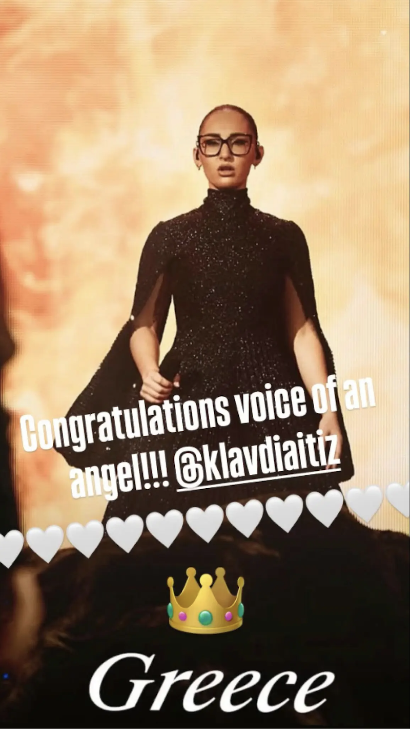 Με ένα λιτό μήνυμα στο Instagram, απηύθυνε τα συγχαρητήριά της στην Klavdia, γράφοντας: «Συγχαρητήρια, φωνή ενός αγγέλου», αντηχώντας φυσικά τη συγκίνηση που προκάλεσε σε εκείνη και σε όλη την Ευρώπη η ερμηνεία της Klavdia.