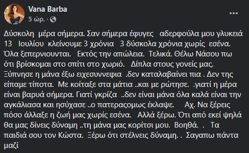 Γιατί γκρίζα ..δεν είναι μάνα, όλα καλά είναι, την αγκάλιασα και ησύχασε… ο πατέρας όμως έκλαψε. Αχ… να ξέρεις πόσο άλλαξε η ζωή μας χωρίς εσένα. Αλλά ξέρω, ότι από εκεί ψηλά θα μας δίνεις δύναμη ..τη μάνα μας κορίτσι μου βοηθά. Τα παιδιά σου, τον Κώστα. Ξέρω ότι στέλνεις δύναμη. Σ’ αγαπώ, πάντα μαζί», έγραψε η Βάνα Μπάρμπα.