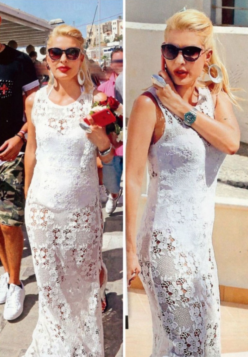 Τον περασμένο καλοκαίρι, όπου κυκλοφόρησαν φωτογραφίες της παρουσιάστριας από το μαγευτικό νησί των Κυκλάδων, είδαμε την Ελένη Μενεγάκη με ένα εντυπωσιακό σύνολο να πηγαίνει στο ATM. Όπως βλέπετε από τα παρακάτω στιγμιότυπα, η ίδια επέλεξε να φορέσει ένα λευκό μακρύ πλεκτό φόρεμα με διαφάνειες, όπου φαινόταν από μέσα το λευκό ολόσωμο μαγιό της.