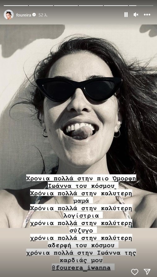 «Χρόνια πολλά στην πιο όμορφη Ιωάννα του κόσμου. Χρόνια πολλά στην καλύτερη μαμά. Χρόνια πολλά στην καλύτερη λογίστρια. Χρόνια πολλά στην καλύτερη σύζυγο. Χρόνια πολλά στην καλύτερη αδερφή του κόσμου. Χρόνια πολλά στην Ιωάννα της καρδιάς μου», έγραψε η Ελένη Φουρέιρα και όπως μπορείτε να δείτε οι δυο αδερφές μοιάζουν πολύ. Ενώ εκτός από την Ιωάννα, η Ελένη Φουρέιρα έχει άλλη μια αδερφή, τη Μαργαρίτα και έναν αδερφό, τον Γιώργο.