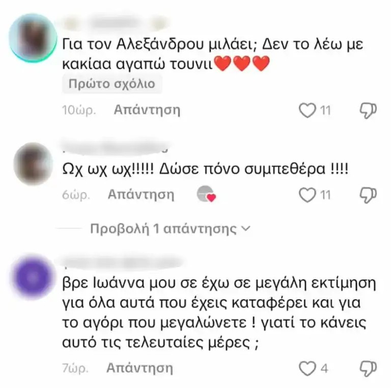 «Βρε Ιωάννα μου σε έχω σε μεγάλη εκτίμηση για όλα αυτά που έχεις καταφέρει και για το αγόρι που μεγαλώνετε! Γιατί το κάνεις αυτό τις τελευταίες μέρες;» έγραψε διαδικτυακή φίλη της 32χρονης, που προφανώς ήταν πεπεισμένη πως η αναφορά της Ιωάννας Τούνη γινόταν για τον Δημήτρη Αλεξάνδρου.