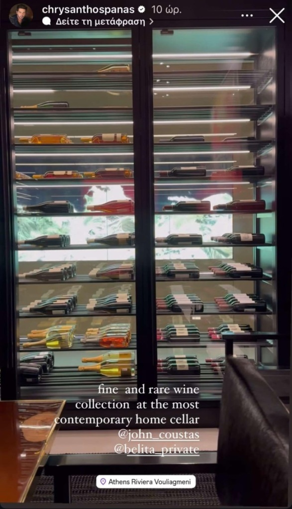 Στη συνέχεια, είχαμε την ευκαιρία να δούμε το σπιτικό κελάρι τους με τις σπάνιες ετικέτες κρασιών. “Μία ποιοτική και σπάνια συλλογή με κρασιά στο σπιτικό κελάρι του Γιάννη και της Δήμητρας Κούστα”, έγραψε ο Χρύσανθος Πανάς.